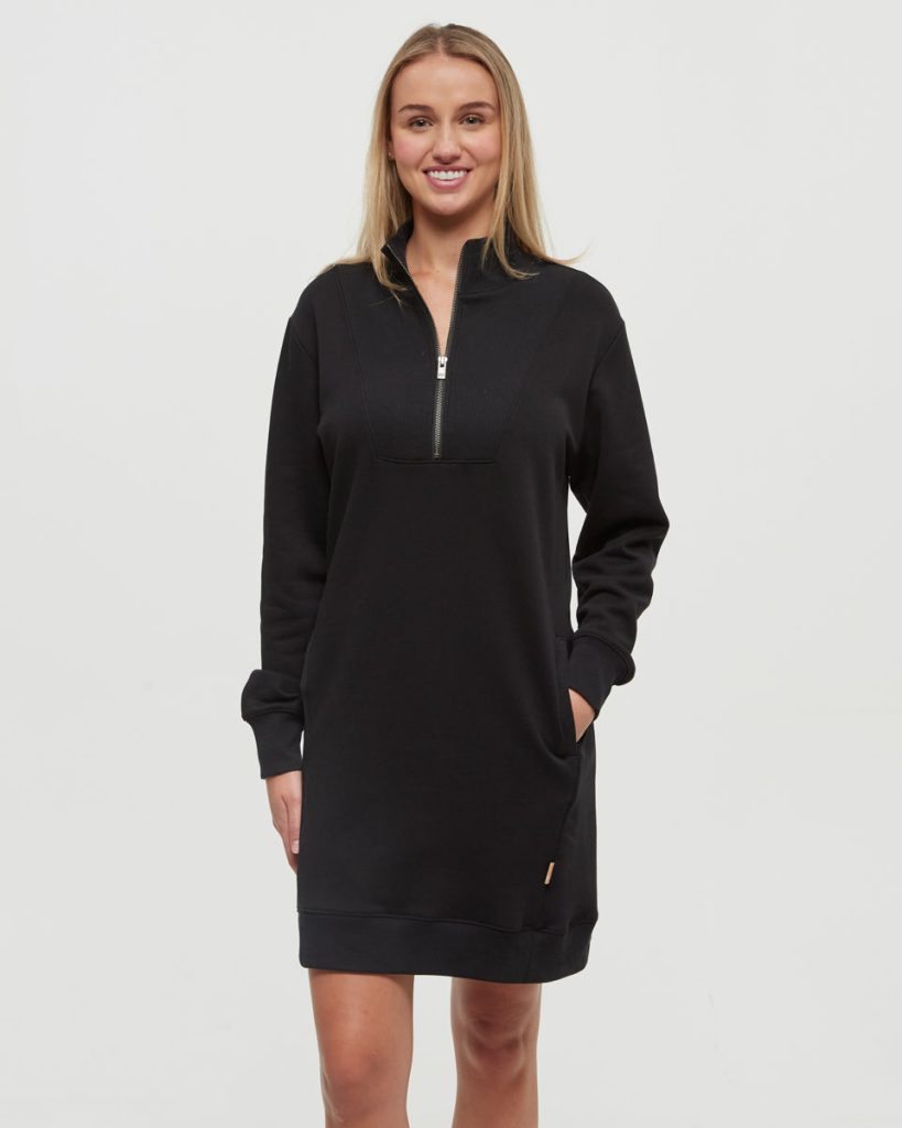 Meet the fleece dress you didn’t know you needed. This half zip is your cozy-day go-to — complete with a mock neck and roomy front pockets.